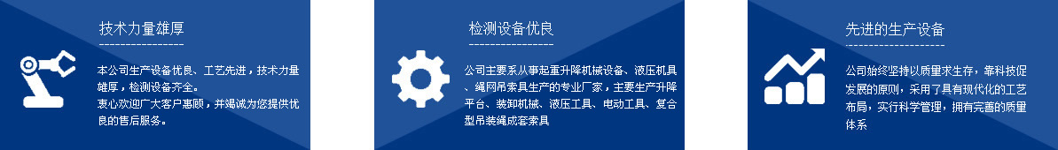 本公司系從事起重升降機械設(shè)備、液壓機具、繩網(wǎng)吊索具生產(chǎn)的專業(yè)廠家,主要生產(chǎn)千斤頂、液壓拉馬、軸承加熱器、升降平臺、裝卸機械、液壓工具、電動工具、復(fù)合型吊裝繩成套索具、高強纖維柔性吊裝帶、起重鏈條成套索具、橫梁吊具、注塑繩、軟梯、安全帶、安全網(wǎng)等幾大系列、上百種規(guī)格的產(chǎn)品,廣泛應(yīng)用于電力、油田、大型鋼廠、機電、化工、航空、冶金、機械、鐵道、造紙、港口、建筑等領(lǐng)域。